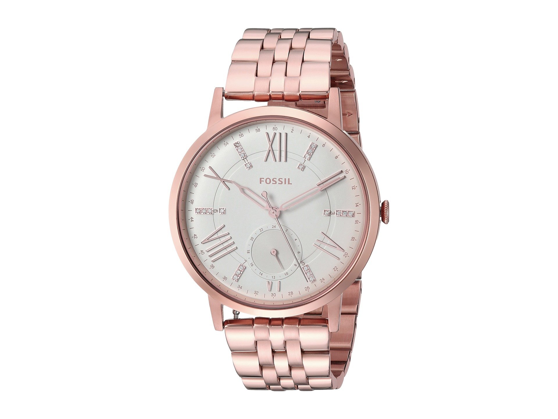 | Product Information SKU: #8931095This dazzling style from Fossil? is sure to keep all eyes on your chic ensemble!Stainless steel case.Stainless steel bracelet with double, push-lock closure.Round face.Three-hand analog display with quartz movement.Dial features rose gold-tone hands and hour markers, crystal detailing, single subdial, minute track, and Fossil detailing.Water resistant 5 ATM.Display case included.Imported.This product may have a manufacturer's warranty. Please visit the manufacturer's website or contact us at warranty@support.zappos.com for full manufacturer warranty details.Measurements: Case Height: 40 mm Case Width: 40 mm Case Depth: 9 mm Band Width: 19 0?1 mm Band Circumference/Length: 9 in Weight: 3.6 oz |