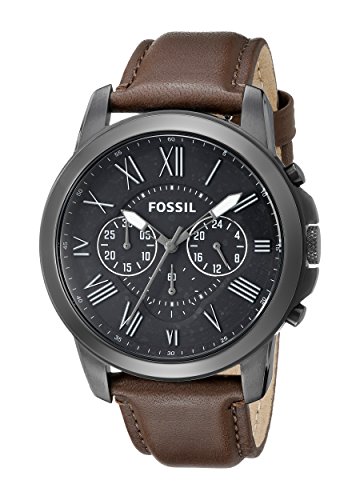 This unique Fossil FS4885 mens analog quartz chronograph watch features a black dial, 3 subdials, and a stainless steel case with a brown leather band.
