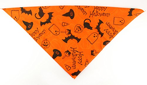 -. Binding : Misc. -. Brand : Groomer's Choice -. Feature : 30" diagonal / Orange bandanna with pumpkins, ghosts, candy corn, cats, and other Halloween delights / 50/50 poly-cotton blend / Spooktacular way to dress up your pet this Halloween season / Made in the USA -. Label : Groomer's Choice -. Manufacturer : Groomer's Choice -. PackageQuantity : 1 -. ProductGroup : Pet Products -. ProductTypeName : PET_SUPPLIES -. Publisher : Groomer's Choice -. Size : Large -. Studio : Groomer's Choice -. Title : Halloween Dog Bandana (Orange Happy Halloween)