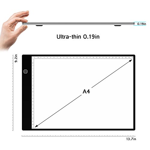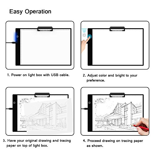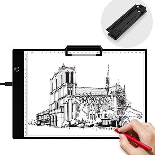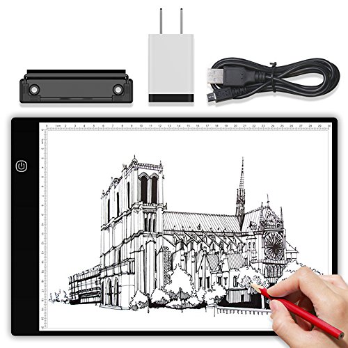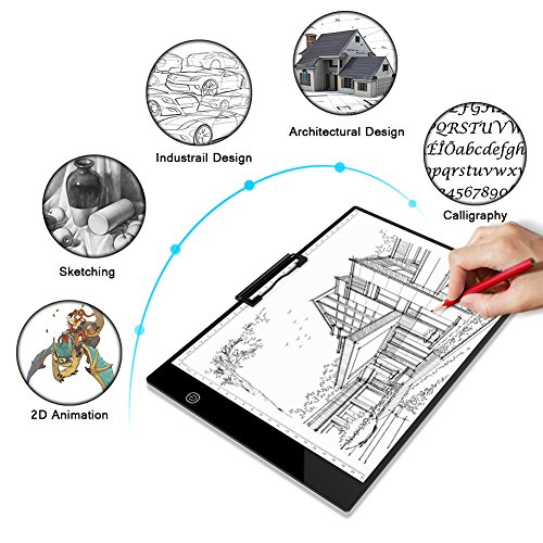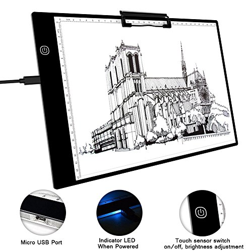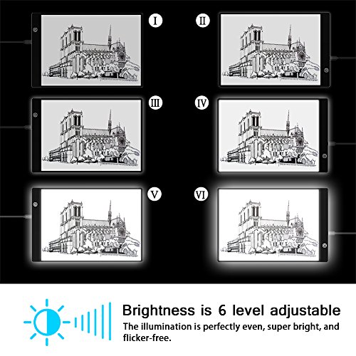 -Portable: Ultra-thin(only 5mm) design, the tracing light box is a sleek light-up pad, the light from the pad through the paper clearly illuminates the images, which make tracing images become easy. -Dimmable: 6-level adjustable dimming brightness, just simply keep pressing the Sensor Switch button can change the Illumination according to your needs and easily turn on / off your light box. -Memory Feature: Smart memory function can keep the the brightness of your last use. -USB Powered: Comes with a mirco USB cableDC 5V adaptor, easily powered on/off via USB cable by plug into any USB port like computer, power bank or USB Plug that connects directly into a wall outlet. -Tracing Paper Clip: Included black tracing paper clip(size: 100*30mm) can make the tracing paper firm which offers you better tracing experience.