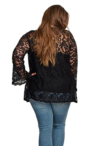 Product Description The perfect plus size cardigan for a feminine layering piece this year. A delicate lace material and flowy bell sleeves will look beautiful layered over a cami and paired with jeans and wedges for a gorgeous ensemble. 0