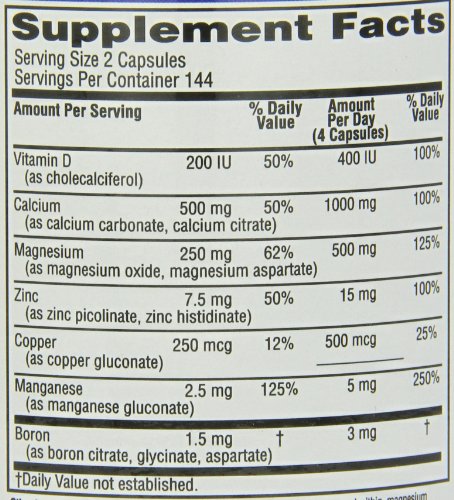 -. Feature : Value size shatter proof bottle / Tri-Boron Plus capsules are easy to swallow and assimilate / Chelated boron with calcium plus magnesium, vitamin D3 and co-factors / Servings per container - 72