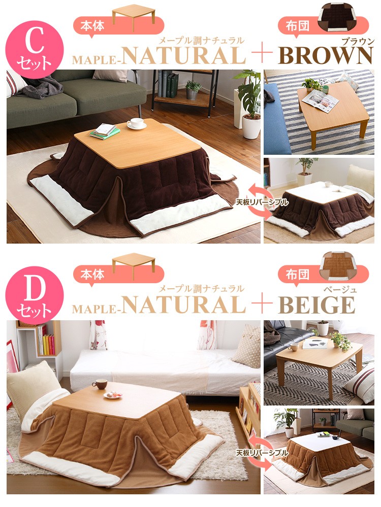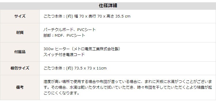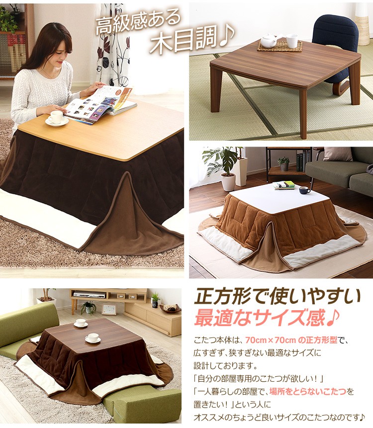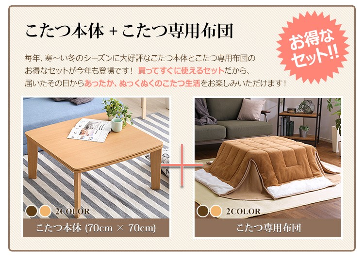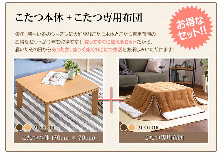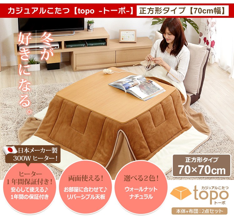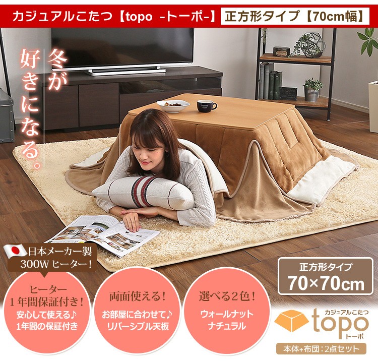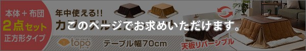 【商品について】カジュアルこたつ【-Topo-トーポ(正方形・70cm幅)】(こたつテーブル+掛布団の2点セット)■サイズ:本体外寸:(約)幅70x奥行70x高さ35.5cm(約)11.74kg布団:(約)幅175x奥行175cm(約)1.7kg■カラー:(Aセット)(Bセット)(Cセット)(Dセット)■素材:天板:パーチクルボード、PVCシート脚:MDF、PVCシート※付属品:300Wヒーター(メトロ電気工業株式会社製)・無段階温度調節機能、温度ヒューズ付・スイッチ付き電源コード布団:表地、裏地、詰め物:ポリエステル100%※洗濯可能(ネット使用)■その他:・完成品でお届けします。※脚はお客様取付け本体:(約)73.5x73x11cm(約)12.6kg布団:(約)45x45x18cm(約)2.7kg
