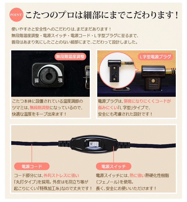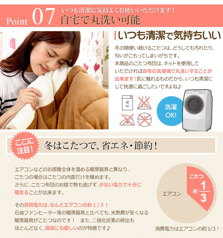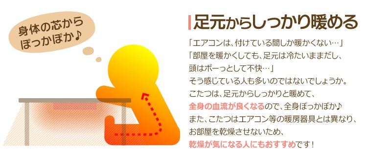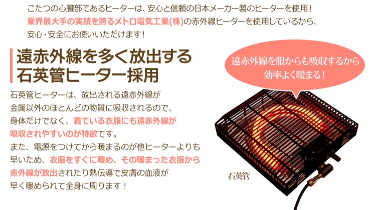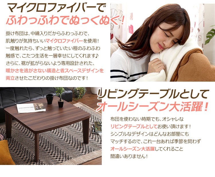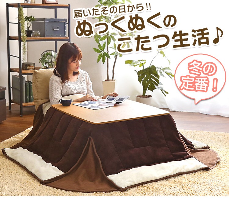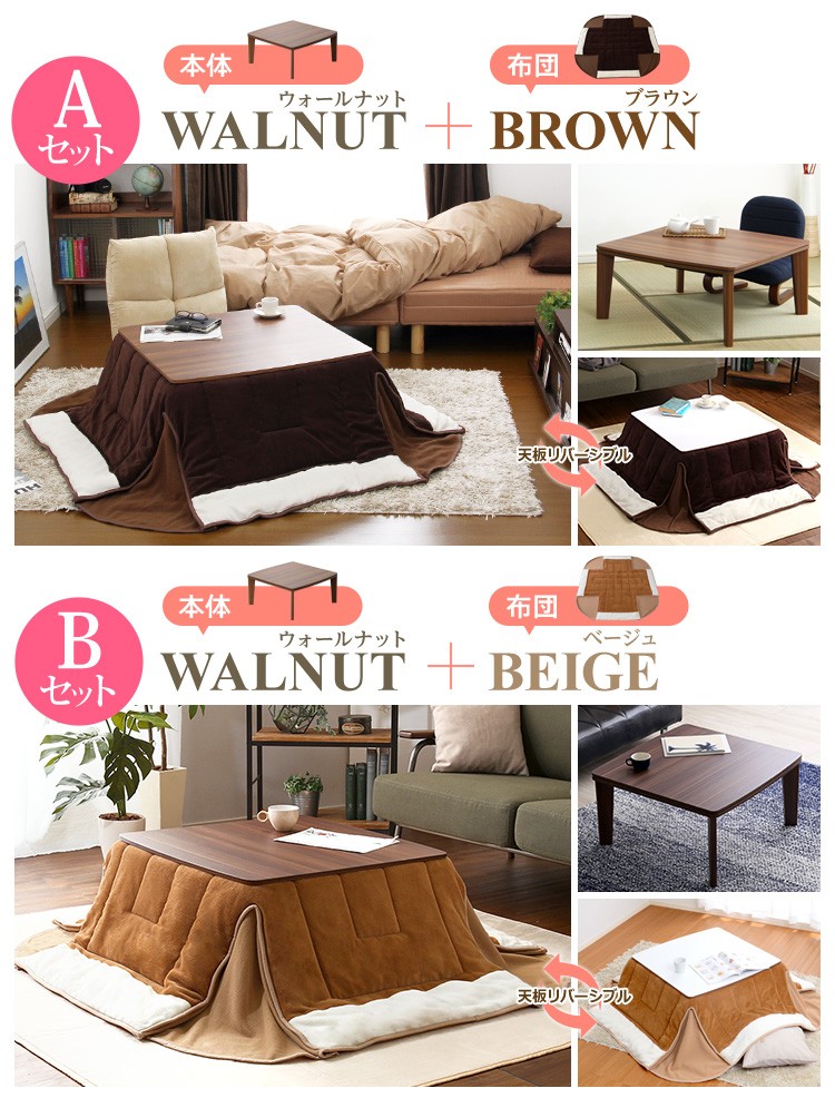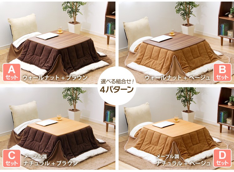 【商品について】カジュアルこたつ【-Topo-トーポ(正方形・70cm幅)】(こたつテーブル+掛布団の2点セット)■サイズ:本体外寸:(約)幅70x奥行70x高さ35.5cm(約)11.74kg布団:(約)幅175x奥行175cm(約)1.7kg■カラー:(Aセット)(Bセット)(Cセット)(Dセット)■素材:天板:パーチクルボード、PVCシート脚:MDF、PVCシート※付属品:300Wヒーター(メトロ電気工業株式会社製)・無段階温度調節機能、温度ヒューズ付・スイッチ付き電源コード布団:表地、裏地、詰め物:ポリエステル100%※洗濯可能(ネット使用)■その他:・完成品でお届けします。※脚はお客様取付け本体:(約)73.5x73x11cm(約)12.6kg布団:(約)45x45x18cm(約)2.7kg