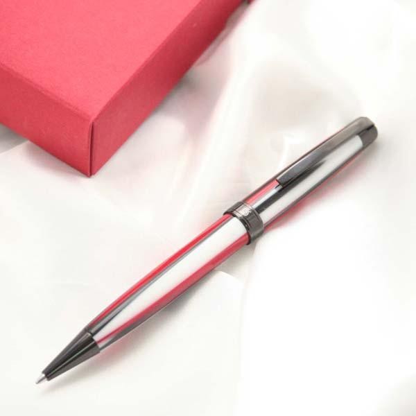 | 赤をベースに白と黒の縦ラインの模様が特徴的でオシャレ!思わず目を引くデザイン性の優れたボールペンです。部分的に使用されている黒が全体を締めて高級感も演出しています。ボディ上部を回すとペンが出るタイプです。軽量で書きやすく男女問わずご使用いただけます。専用のボックスに入っていますので、プレゼントにもぴったりです。 |
