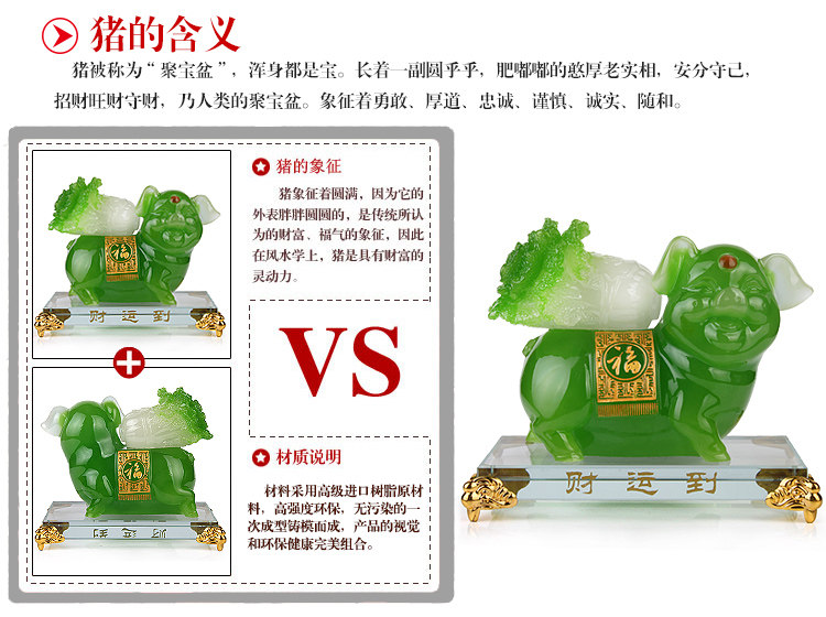 Product features: Pig?fat?round?appearance,?is?a traditional symbol of?wealth,?the?blessing,therefore?in Feng Shui,?the pig?is a?wealth?of?smart?power.?General?tohave?pigs appear,?is?the?increasing?financial?means,?we can choose thehome or workplace?placed?Feng Shui?pigs to?Wang?moving?sources.Because of?money,?so the?Feng Shui?pig?display?a very important position,?basically?in addition to location?not?toilet?outside,?other?all can,but still the best?equipment in?the fiscal position. Product?introduction: Name:?wealth?to the?blessing pig. Material:?resin Size:?about 15cm long?width 8.5cm height?13cm Weight: 0.99kg?net weight 1.36kg?package Packaging:?packaging?mascot |
