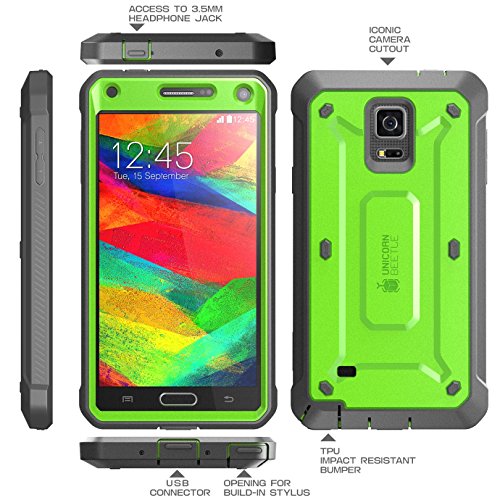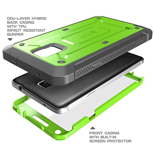 Compatibility: Compatible with Samsung Galaxy Note 4 (2014 Release), allowing full access to touchscreen, camera, buttons, and ports. NOT COMPATIBLE with Samsung Galaxy Note 3 or any other Samsung models. Materials: High grade polycarbonate + thermoplastic polyurethane for shock absorption. Front cover with built-in screen protector prevents scratches without compromising sensitivity. Design: Designed with both protection and looks in mind, SUPCASE Unicorn Beetle PRO Series Full-body Hybrid Case provides shock absorption and scratch prevention while maintaining a sporty profile. - Advanced front cover design for easy installation - Built-in screen protector without compromising sensitivity - Advanced dual-layer (PC + TPU) design provides great impact and shock resistance and prevents accidental drop, bump, and shock - Port cover keeps out debris and dust - Easy access to all features (buttons, camera, speaker, and ports) - Sporty profile and multiple color options - Belt Clip Holster What's in the package? 1x SUPCASE Unicorn Beetle PRO Belt Clip Holster CaseFeature
