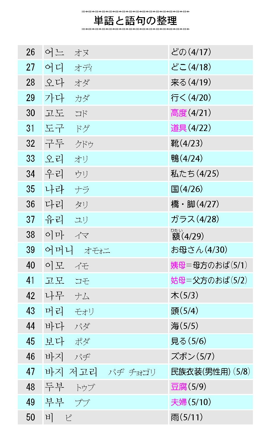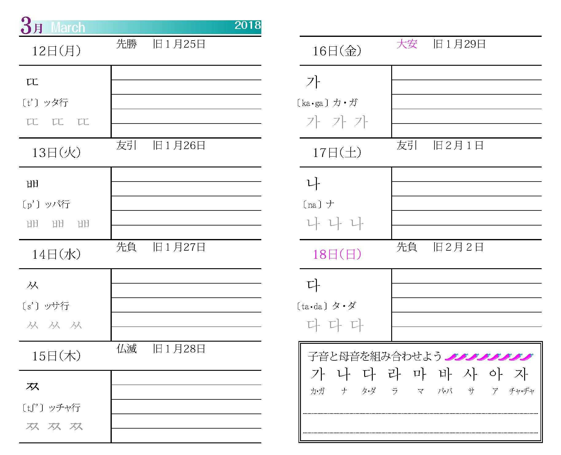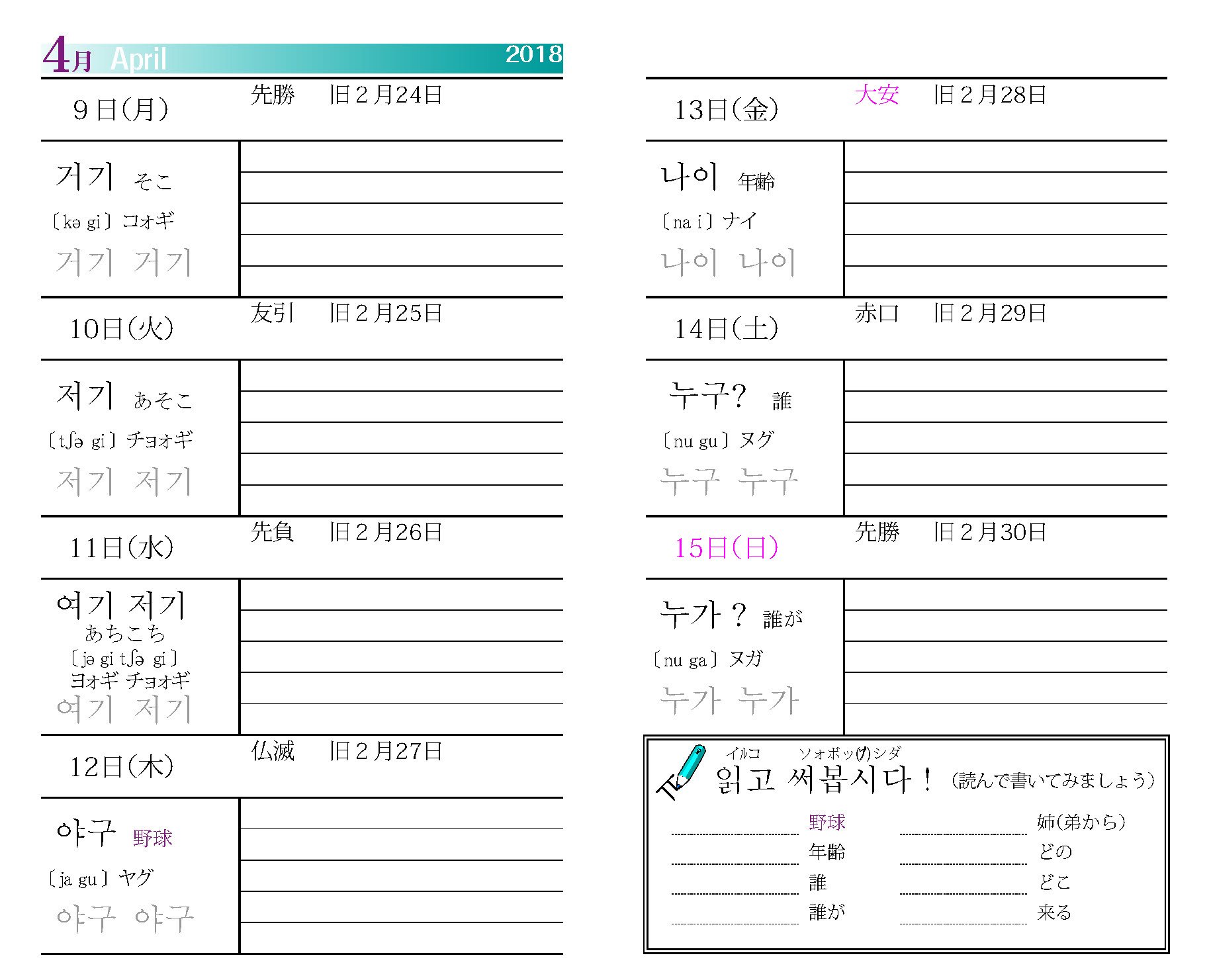 Ideal for learning Korean characters. There is also a writing order, so I am learning and studying. Since there is a kana display, it is helpful to understand how to read it. Since it opens everyday as a schedule book, Hangul has touched the eyes and arrived at the large alter ego. I would like to absorb more with a new notebook 😊