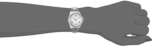 -. Feature : Silver-tone watch in stainless steel featuring crystal-set bezel and Roman Numeral hour markers on textured dial border / Quartz movement with analog display / Protective glass crystal dial window / Features deployant buckle closure, triple-row link bracelet, and notched bezel / Water-resistant to 100 m (330 ft)