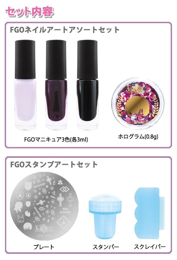 | セット内容 | 【FGOネイルアートアソートセット】 FGOマニキュア3色(各3ml)、ホログラム(0.8g) 【FGOスタンプアートセット】 プレート、スタンパー、スクレイパー |