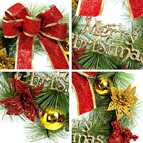 - SUPREME MATERIAL- Christmas wreath is made of PVC and pine needle, which designed with a magnificent hand-tied bow, glittered twigs, leaves, pine cones and colored balls to fit all-season, especially Christmas decoration