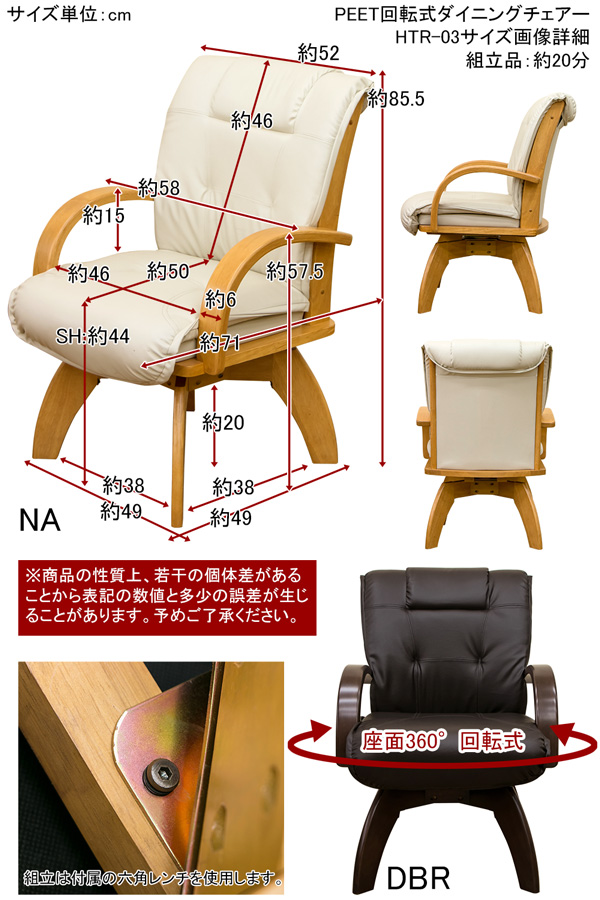 本商品はお取り寄せ商品のため、稀にご注文入れ違い等により欠品・遅延となる場合がございます。誠に恐れ入りますが、何卒ご了承ください。 また、以下の場合には追加送料がかかる場合がございます。  ・大型商品の複数購入時 ・同梱区分が異なる商品の複数購入時  【出荷目安】:1 - 4営業日 ※土日・祝除く 【同梱区分】:TS 1490 【梱包サイズ】:大型商品 【代引き決済】:不可  配送伝票の依頼主は出荷元(メーカーもしくは仕入元)名となる場合がございますので、お受け取りの際はご注意ください。   【型番】htr03  【商品名の色やサイズについて】 こちらは「360度回転式ダイニングチェア/リビングチェア 【1脚】 ナチュラル 『PEET』 肘付き 張り地:合成皮革(合皮)」の商品ページです。商品画像や商品情報には、色違いやサイズ違いの商品が載っている場合がございます。ご注文前に色・サイズ・セット内容のご確認をお願いいたします。  PEET 回転式ダイニングチェアです  座面は360度回転します 張り材はお手入れし易いPVCです 座面も背もたれも厚めなクッションです  ダークブラウン(DBR)、ナチュラル(NA)の2色展開です  ※組み立ての際の注意点※ ボルトは座面裏に取り付いた状態で届きます 付属の工具で外していただいてから組み立てて下さい  幅580×奥行710×高さ855mm(梱包サイズ:幅585×奥行715×高さ580mm) 座面高:約440mm 座面厚:約100mm 本体重量:13kg(梱包重量:16kg) 組立式(約20分/付属の六角レンチにて組立)1梱包 フレーム:天然木ラバーウッド(アミノアルキド樹脂塗装) 張り材:合成皮革(PVC) 中材:ウレタンフォーム  原産国:タイ  【ご注意事項】 ※本商品は、北海道・沖縄・離島への配送はいたしかねます。あらかじめご了承ください。