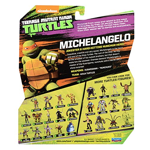 -. Binding : Toy -. Brand : Teenage Mutant Ninja Turtles -. EAN : 0885667206947 -. Edition : 1st -. Feature : Jokester and Hard-Hitting Nunchuck Hero / With more than 12 points of articulation, these action figures are the most highly detailed and articulated Turtle figures ever made! / Each turtle figure is uniquely sculpted, with heights ranging from 4.25 inches to 5.25 inches, to capture the individual personalities of the characters from the Teenage Mutant Ninja Turtles TV show / Each Turtle is wearing his signature bandana and comes packed with their two core Ninja weapons and added weapons rack for hours of Ninja playing excitement / 2012 Viacom International Inc.; All Rights Reserved; TEENAGE MUTANT NINJA TURTLES and all related titles, logos and characters are trademarks of Viacom International Inc. -. IsAdultProduct : 0 -. Label : Teenage Mutant Ninja Turtles -. Manufacturer : Teenage Mutant Ninja Turtles -. Model : 90618 -. MPN : 90618 -. NumberOfItems : 1 -. PackageQuantity : 1 -. PartNumber : 90618 -. ProductGroup : Toy -. ProductTypeName : TOYS_AND_GAMES -. Publisher : Teenage Mutant Ninja Turtles -. Studio : Teenage Mutant Ninja Turtles -. Title : Teenage Mutant Ninja Turtles New Deco Michelangelo Figure -. UPC : 043377906186 -. Warranty : No Warranty