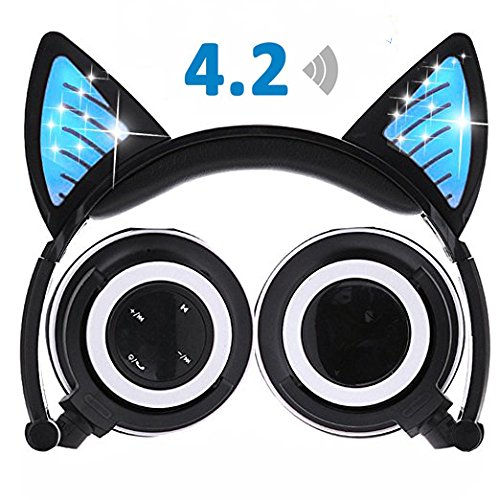 - ♫ 2017 NEW VERSION DESIGN: Cat ear LED lights glowing,Wireless Bluetooth 4.2 CSR,Bluetooth transmission distance up to 10 meters, high speed data transmission.Built-in Microphone,Volume controller,Music Play/Pause(Songs Switch),Answer/Hang up calls,3.5mm Wired Cable Music Streaming.