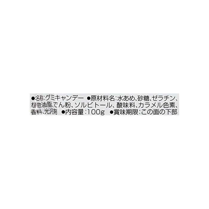 원재료:물엿,설탕,젤라틴,식물성 기름지,나오지 않겠 분,솔《비토루》,신맛료,카라멜 색소,향료,광택 제