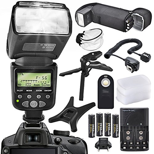Accessory bundle includes an AA battery with compatible charger, 3 Ft. off-camera flash cord, universal remote, hand grip handheld tripod, universal diffuser, and flash pouch
