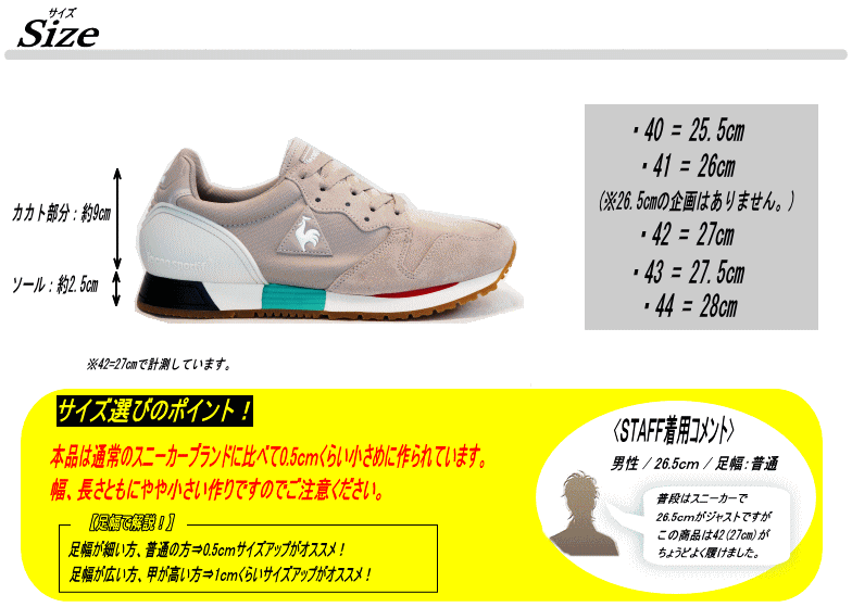 | サイズ | 作り⇒やや小さめ (※26.5cmの企画はありません。) 【サイズ選びのポイント!】 足幅が細い方、普通の方⇒0.5cmくらいサイズアップがオススメ! 足幅が広い方、甲が高い方⇒1.0cmくらいサイズアップがオススメ! |