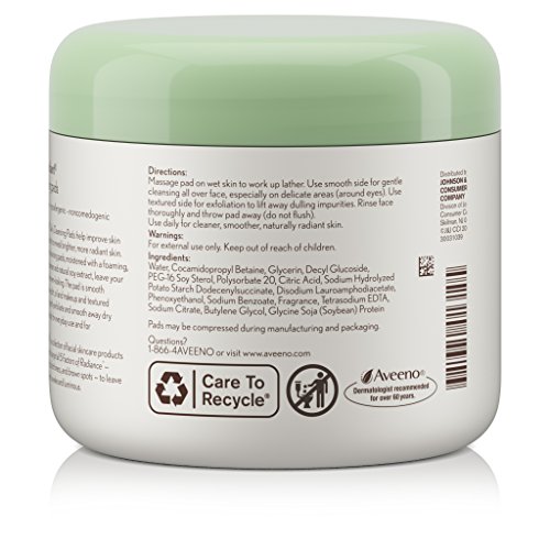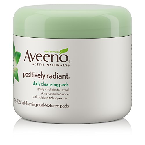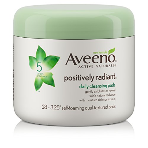Aveeno Positively Radiant Daily Cleansing Pads, 28 Count are pre-moistened, self-foaming pads that help improve your skin's texture in just one week. For brighter skin, these cleansing pads are shown to improve skin tone, texture, dullness, and brown spots. One side of the pad is lightly textured to exfoliate and smooth dry patches, and the other is flat to lift away dirt, oil, and makeup. These pads with moisture rich soy extracts help even out skin tone and texture without over-drying. The mild formula is soap- free, oil-free, hypoallergenic, and non-comedogenic, so it's gentle enough for everyday use even for sensitive skin.Feature