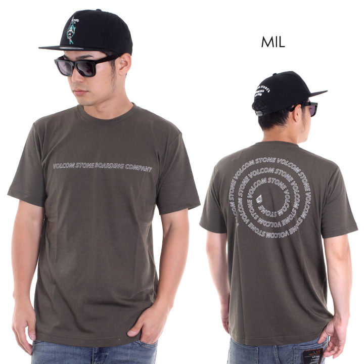 フロントに"VOLCOM STONE BOARDING COMPANY"のロゴ、バックに"VOLCOM STONE"のワードをらせん状にプリント。