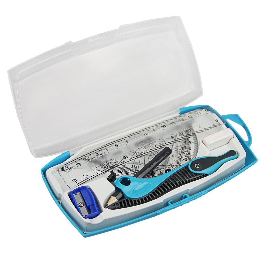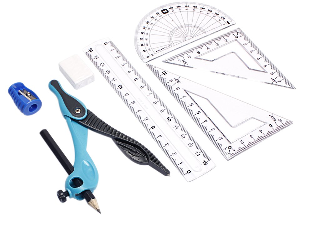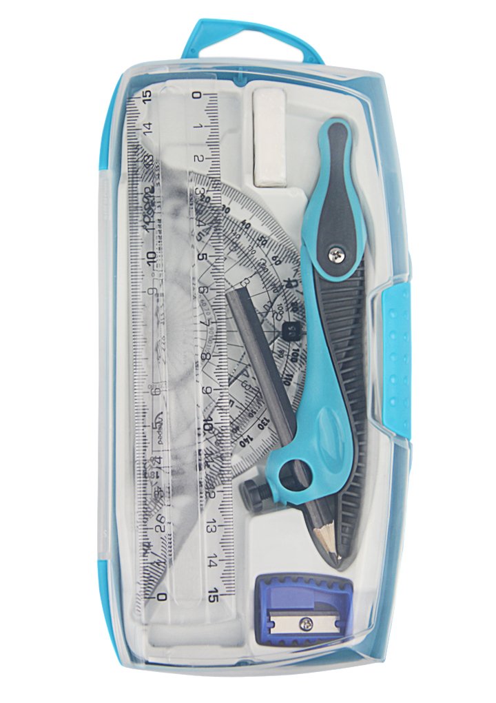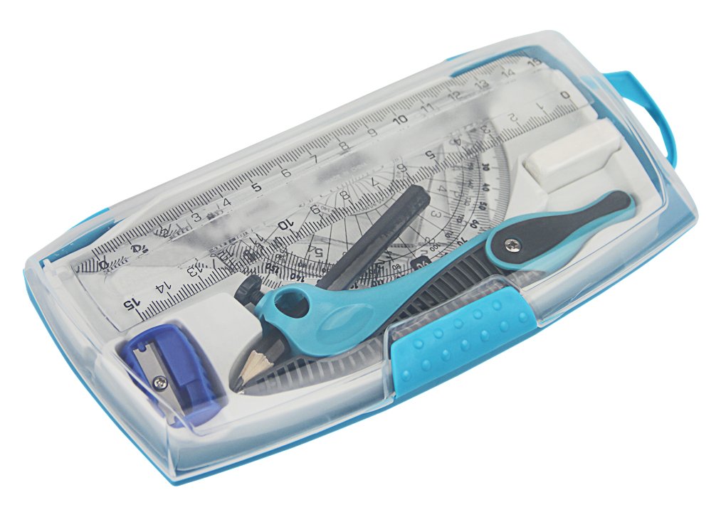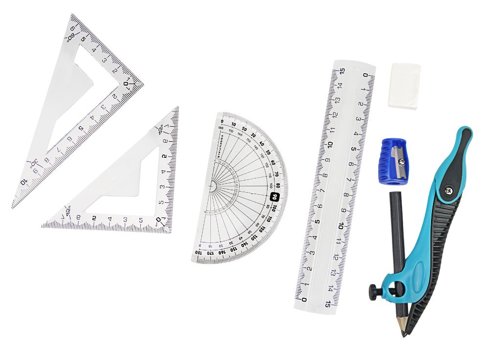 Contents: Compass pencil body × 1 straight rectangle 15 cm × 1 piece right angle isosceles triangle ruler 10 cm × 1 right angle triangle ruler 10 cm × 1 piece protractor 9 cm × 1 piece eraser × 1 piece pencil sharpener × 1 piece pencil × 1 piece