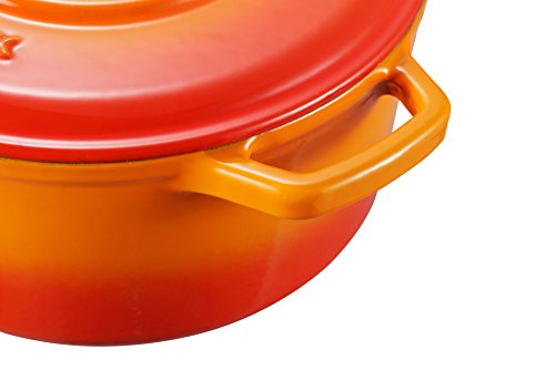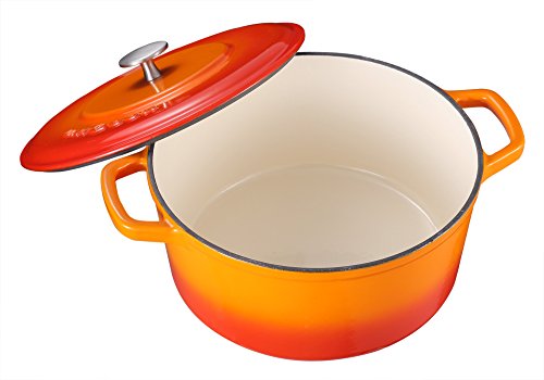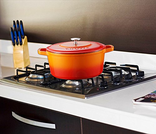 Durable porcelain enamel exterior and interior requires no additional seasoning, the appealing bright color enameled finish adds a decorative touch to your table and kitchen, offers elegant kitchen to table serving