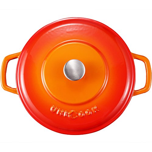 Unicook Dutch Oven is designed to enhance slow cooking through gentle, even heating, locking moisture for tender, succulent braises and stews. Though dutch ovens can appear in stainless steel or other materials, only cast iron dutch ovens work properly, enamel-coated cast iron as it will not only absorb, distribute, and retain heat evenly and efficiently but it's rust-proof and easy to wash to boot. The enamel coating makes the pot dishwasher-safe and freezer-safe, and it won't react with tomatoes or other acidic ingredients.