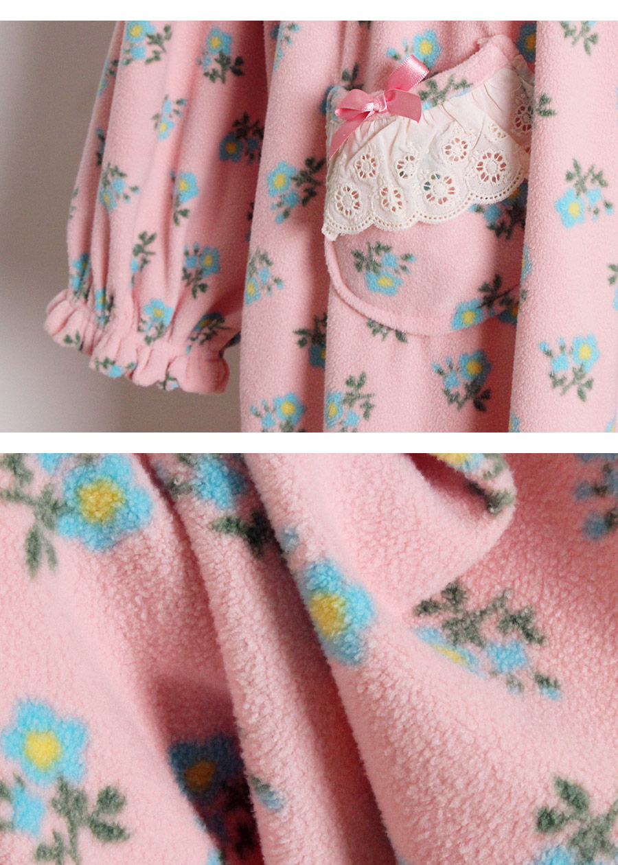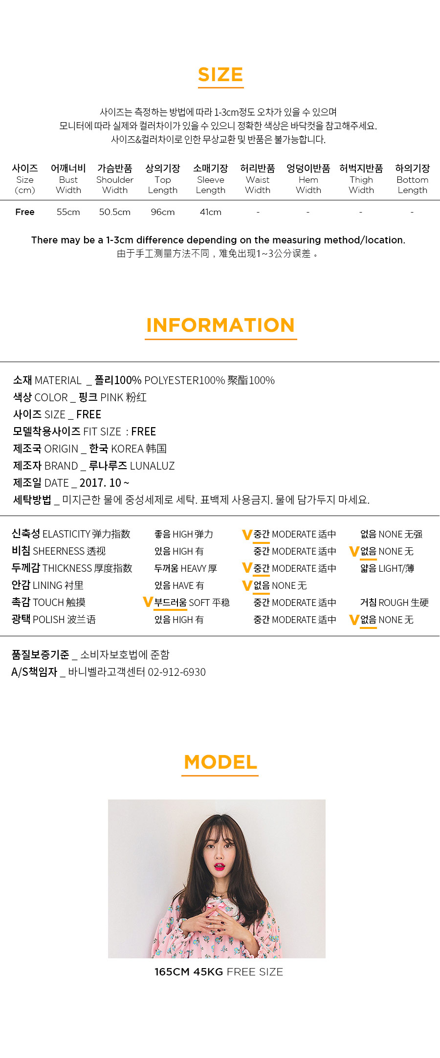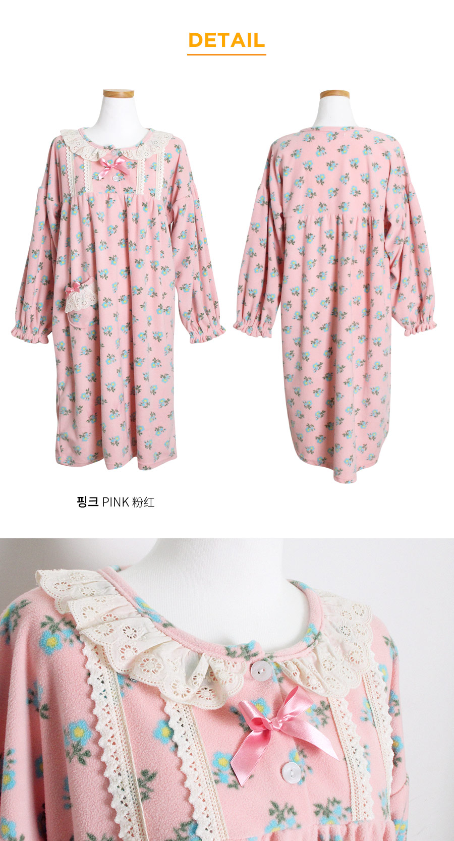 포근한 보온성을 가진 폴라폴리스 소재로 겨울 실내에서 가볍게 입기 좋습니다. 부담스럽지 않은 폴라폴리스 소재로 보온성은 갖추고, 실용성은 높여준 원단입니다. 깔끔하게 입기 좋은 러블리한 핑크 컬러로 제작했습니다. 아기자기한 플라워 프린팅이 걸리쉬함을 살려준 러블리한 홈웨어로 적극 추천해드리고 싶습니다. 소재의 특성상 필링 현상이 일어날 수 있는 점 참고 부탁드립니다 :>DETAIL쇄골 라인이 여리해보이는 라운드 네크 라인에 고가의 베이지컬러 면 레이스 장식을 봉제해 포인트를 주었습니다. 전체 오픈형으로 탈 착용이 좋고, 래글런패턴을 응용해 여리하게 떨어지는 소매 핏이 러블리한 느낌을 더해줍니다. 소매 부분을 볼륨감 있게 살려주는 패턴으로 입었을 때, 전체적으로 걸리쉬함이 잘 살려진 패턴의 디자인이라는 것을 보실 수 있을 거에요~! 래글런패턴을 응용하여 여리하게 떨어지는 소매 핏이 사랑스러운 느낌을 더해주는데요.^^ 미니 포켓을 달아 포인트를 주고 세로로 면레이스 장식을 봉제해 포인트를 주었습니다. SIZE여성 사이즈는 평균 44반~66반size까지 적합한 홈웨어입니다.