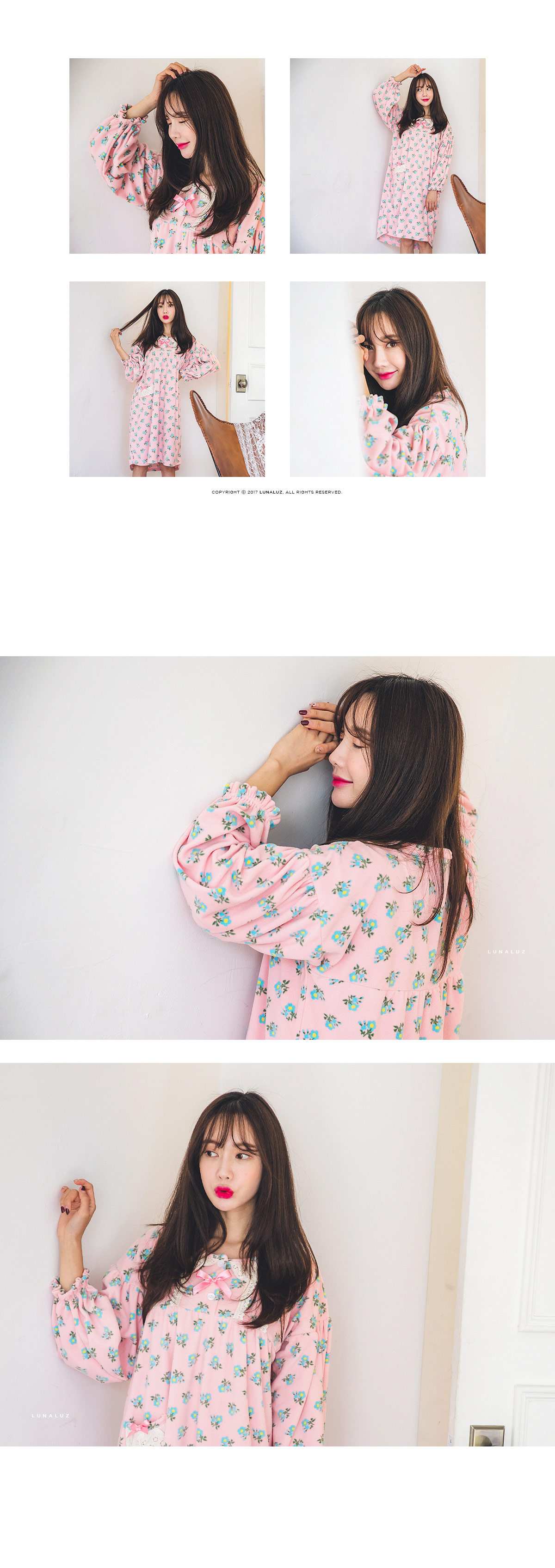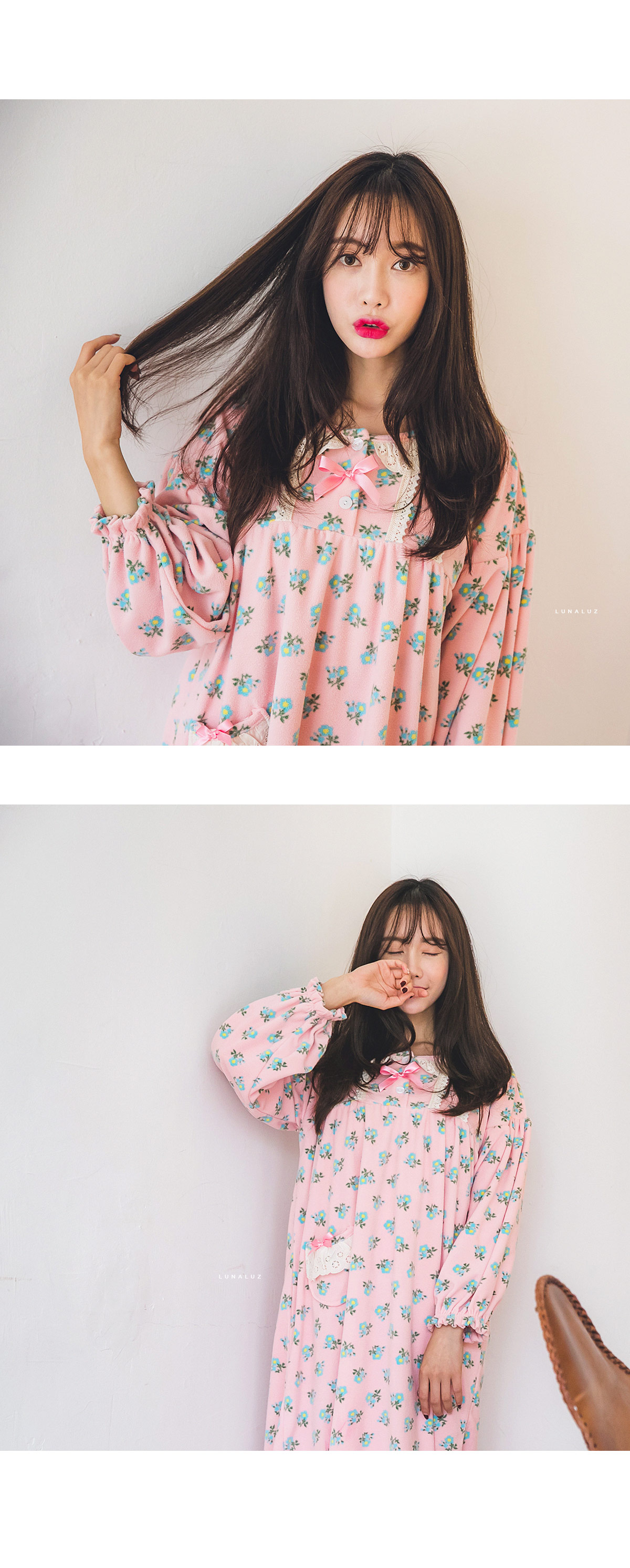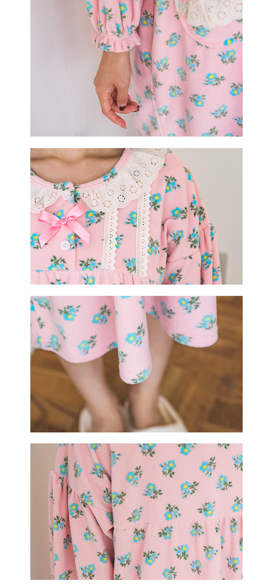 포근한 보온성을 가진 폴라폴리스 소재로 겨울 실내에서 가볍게 입기 좋습니다. 부담스럽지 않은 폴라폴리스 소재로 보온성은 갖추고, 실용성은 높여준 원단입니다. 깔끔하게 입기 좋은 러블리한 핑크 컬러로 제작했습니다. 아기자기한 플라워 프린팅이 걸리쉬함을 살려준 러블리한 홈웨어로 적극 추천해드리고 싶습니다. 소재의 특성상 필링 현상이 일어날 수 있는 점 참고 부탁드립니다 :>DETAIL쇄골 라인이 여리해보이는 라운드 네크 라인에 고가의 베이지컬러 면 레이스 장식을 봉제해 포인트를 주었습니다. 전체 오픈형으로 탈 착용이 좋고, 래글런패턴을 응용해 여리하게 떨어지는 소매 핏이 러블리한 느낌을 더해줍니다. 소매 부분을 볼륨감 있게 살려주는 패턴으로 입었을 때, 전체적으로 걸리쉬함이 잘 살려진 패턴의 디자인이라는 것을 보실 수 있을 거에요~! 래글런패턴을 응용하여 여리하게 떨어지는 소매 핏이 사랑스러운 느낌을 더해주는데요.^^ 미니 포켓을 달아 포인트를 주고 세로로 면레이스 장식을 봉제해 포인트를 주었습니다. SIZE여성 사이즈는 평균 44반~66반size까지 적합한 홈웨어입니다.