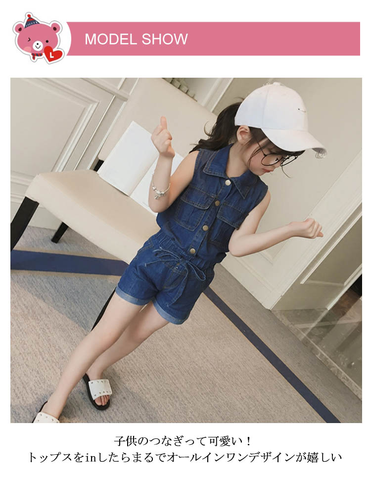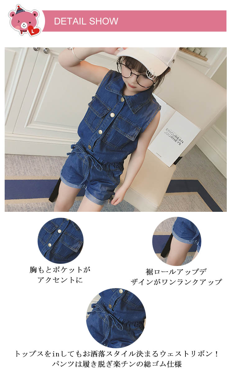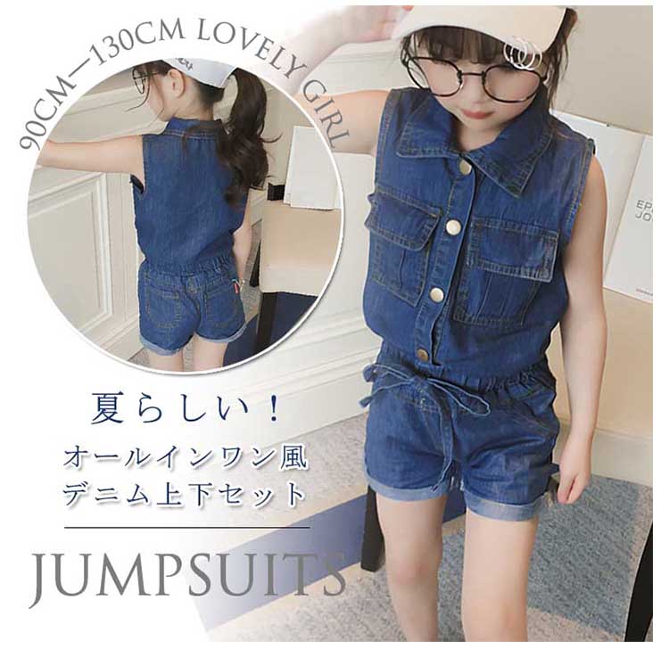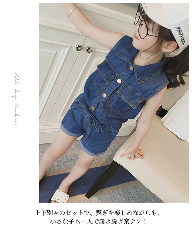 | 夏らしい!オールインワン風デニム上下セット子供のつなぎって可愛い!トップスをinしたらまるでオールインワンデザインが嬉しい上下別々のセットで、繋ぎを楽しめながらも、小さな子も一人で履き脱ぎ楽チン!着心地の良さとお洒落さを両立させた大人気のセットアップ!うっとり柔らかいデニム生地を採用し、小さな子にも安心して着ていただけます | |