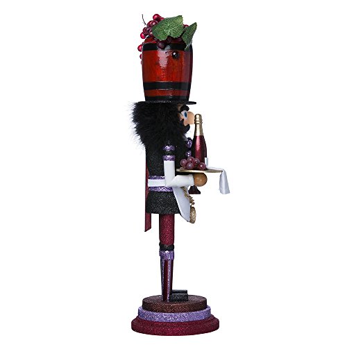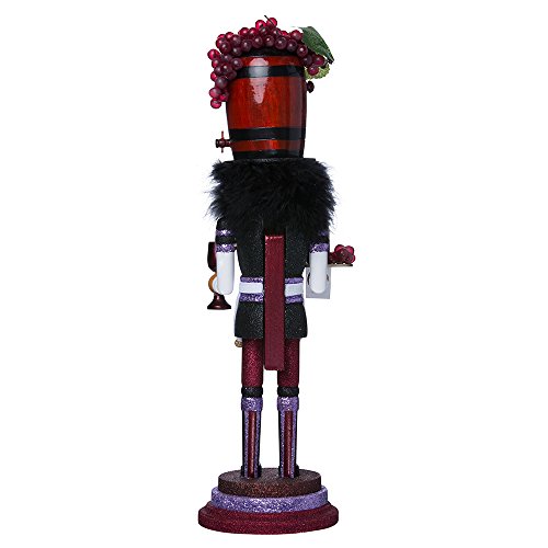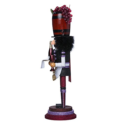 This Kurt Adler 19" Hollywood Wine Nutcracker is a fun, festive way to add to your holiday décor or nutcracker collection! Designed by renowned artist Holly Adler, Hollywood Nutcrackers is a whimsical collection of nutcrackers created exclusively for Kurt S. Adler, Inc. and features an assortment of characters including Christmas, fantasy and everyday nutcrackers. Their designs put a unique, vibrant, memorable twist on traditional nutcrackers. Like all Hollywood Nutcrackers, this nutcracker represents Christmas in a unique, glittery way. Perfect for wine lovers, his hat is a wine barrel topped with realistic purple grapes; his outfit has a wine-colored theme, with shades of purple, red, gold, and black. He is holding in one hand a serving tray with purple grapes, a bottle of red wine, and a napkin, and in the other hand he is holding a purple wine glass.Feature