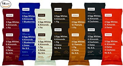 -. Feature : Healthy, delicious protein bars made with nutritious, real food ingredients. / Each variety pack of RXBARs contains one bar of each delicious flavor: / Chocolate Sea Salt, Coconut Cacao, Blueberry, Coffee Cacao, Peanut Butter, Apple Cinnamon, and Pumpkin Spice. / Eight or Less 100% Natural Ingredients: No grains, added sugars, gluten, soy, dairy or any artificial or processed ingredients. / 12g of protein in every 1.83 ounce bar comes from all-natural egg whites and raw almonds.