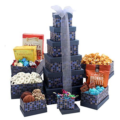 -. Feature : A wonderful sympathy gift to express your condolences in times of need and sorrow / Perfect gift basket for family and friends, or as a corporate office gift. / Gift tower includes: English Toffee (2pc), Chocolate Enrobed Sandwich Cookies (2pc), Brownie brittle salted caramel (1oz), Ice Blue Mint Squares (4oz), Mini Yogurt Pretzels (5oz), Gourmet Caramel Popcorn (5oz), Tavolare Savory Snack Mix (2oz), Assorted Toffees (3oz), Old Dominion Peanut Crunch (3oz), Fruit Flashers, Assorted (2.75oz) / GIFT TOWER DIMENSIONS: 7" x 5" x 16" / Kosher Certified OK D. Giving a kosher gift ensures that all recipients can enjoy and partake in your gift.