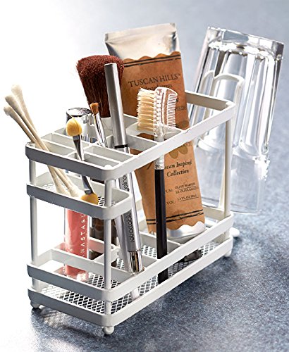 - With this Metal Bathroom Countertop Organizer you can contain your clutter in one spot. It's designed to hold your toothbrush, toothpaste and water cup. Has 8 slots, including a large slot for the toothpaste tube and a hanger on the side for your cup. Mesh bottom prevents water from collecting. Can also be used to store makeup. 7-1/4"W x 2-5/8"D x 4-1/8"H.