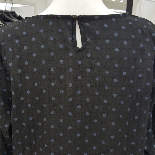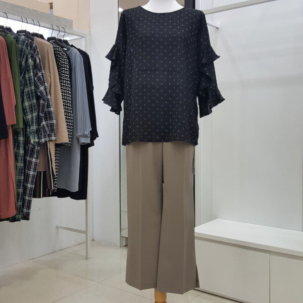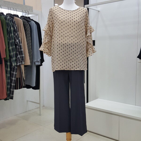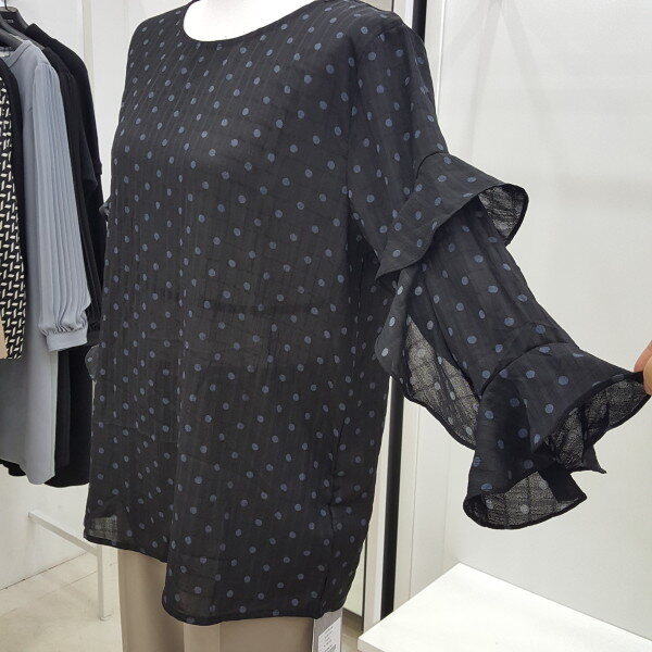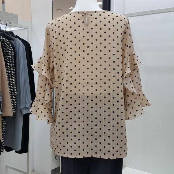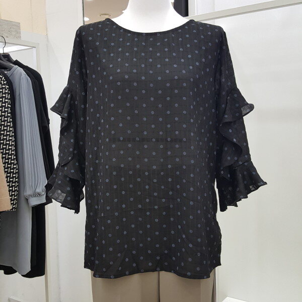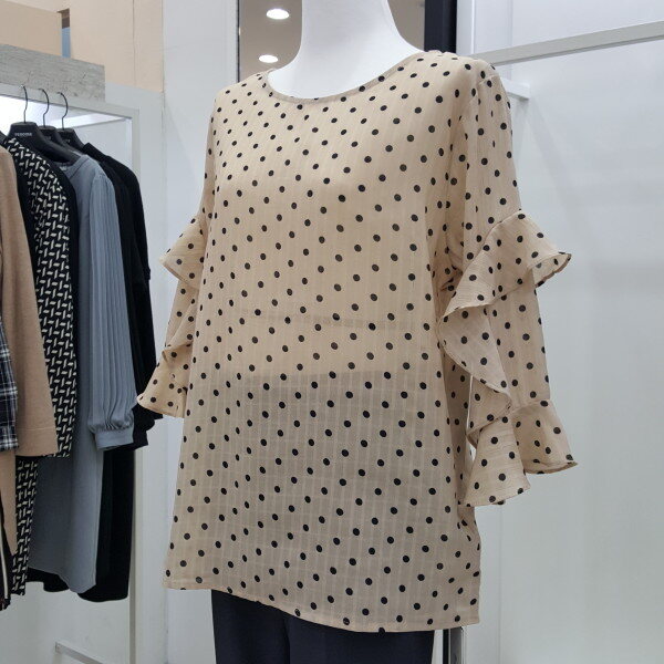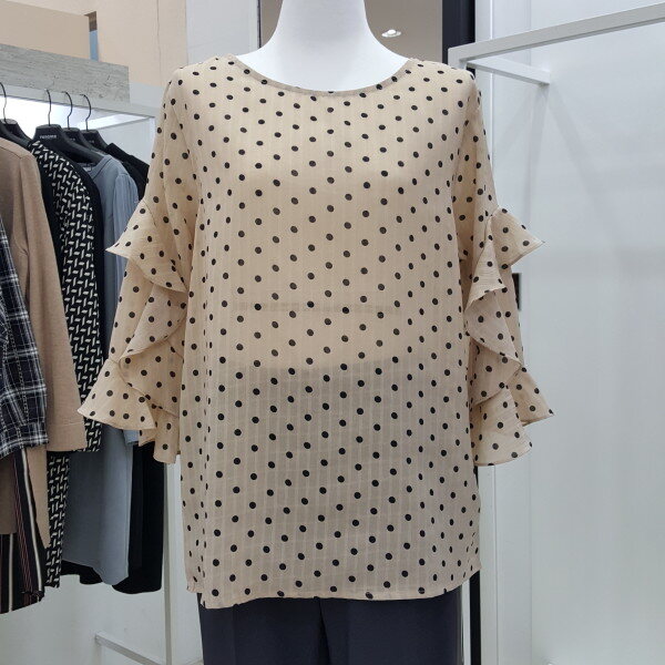 " 도트 프릴 블라우스 "도트 패턴에 자연스럽게 ?흘러내리듯 레이스를 소매 부분에 포인트를 주어 여성스러움을 강조한 블라우스 입니다.여리여리한 실루엣에 스커트나 팬츠 모두 코디하기 용이한 데일리 블라우스입니다.색상 : 베이지, 블랙사이즈 : 프리?