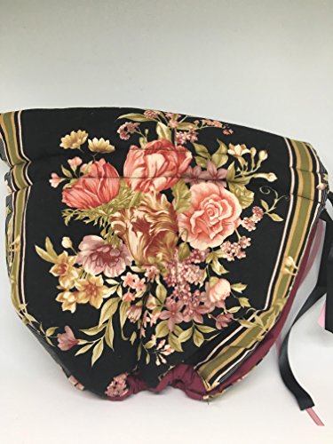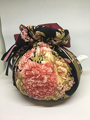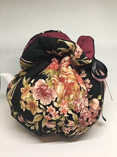Product Description Reversible Tea Cozy in a wrap style with elastic bottom, double ribbon top closure. The outer side is a gorgeous floral bouquet print on black. It's lined with 2 layers of batting and has a reversible option to a solid burgundy wine. The tea pot is for illustration only and is a 4 cup brown betty style. 0