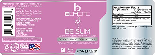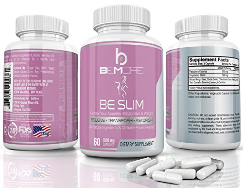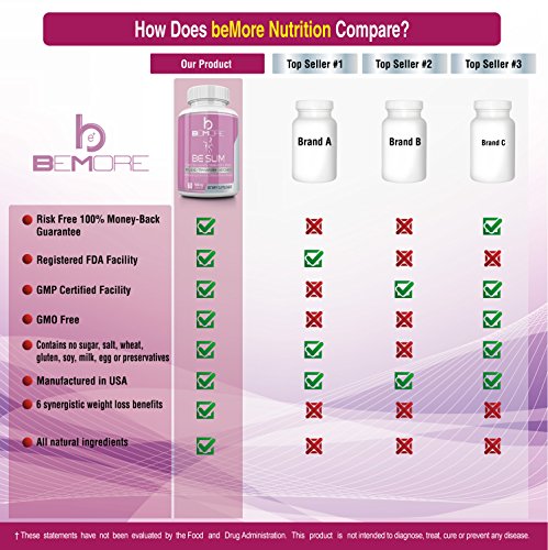 -. Feature : ♥ RELIABLE | The BE SLIM 6-in-1 Fat Burning & Weight Loss Formula for Women includes all natural ingredients clinically shown to help boost metabolism, increase energy, burn fat, control appetite and control hunger cravings so you can lose weight safely and naturally while delivering essential amino acids to nourish and protect lean muscle so you can stay active and burn calories even while you sleep! / ♥ UNIQUE | Unlike other diet pills for women, we wanted to create something more than your average fat burner or weight loss pill to give you the best thermogenic supplement available that does more than suppress your appetite to control hunger cravings. We used a unique proP.R.Ietary blend of natural herbal extracts and essential amino acids to deliver the most effective and safest weight loss, energy boosting, muscle toning formula out there. / ♥ ALL-NATURAL | We use only 100% Natural and Non-GMO ingredients formulated without sugar, synthetic ingredients or gluten. Our ingredients include Raspberry Ketones, African Mango Seed, Cocoa Extract (Theobroma Cacao Seeds), Green Tea (Camellia Sinensis Leaves), and L-Carnitine for unparalleled metabolism enhancing results. / ♥ OUR COMMITMENT TO QUALITY, PURITY, & SAFETY | beMore Nutrition manufactures BE SLIM in facilities certified Good Manufacturing Practices (cGMP) using only the highest quality ingredients. All of our products are manufactured in the USA at FDA registered facilities using ingredients that are rigorously tested purity and quality. Don't be fooled the others and settle for anything but the best for your body, health, and wellness! / ♥ OUR 100% MONEY BACK GUARANTEE | The beMore team is so confident that you'll love BE SLIM that if for some reason you don't we will happily give you 100% refund... even if you give us back an empty bottle! So, what do you have to lose? Don't be less; BEMORE! And definitely BE SLIM!