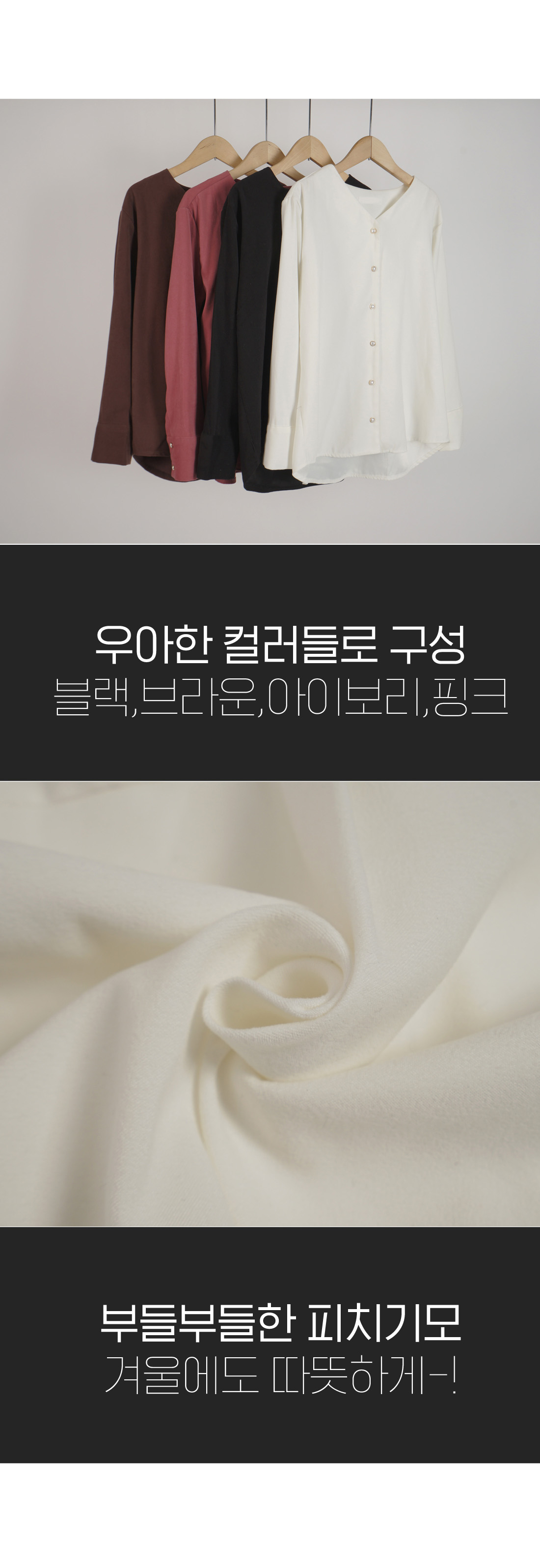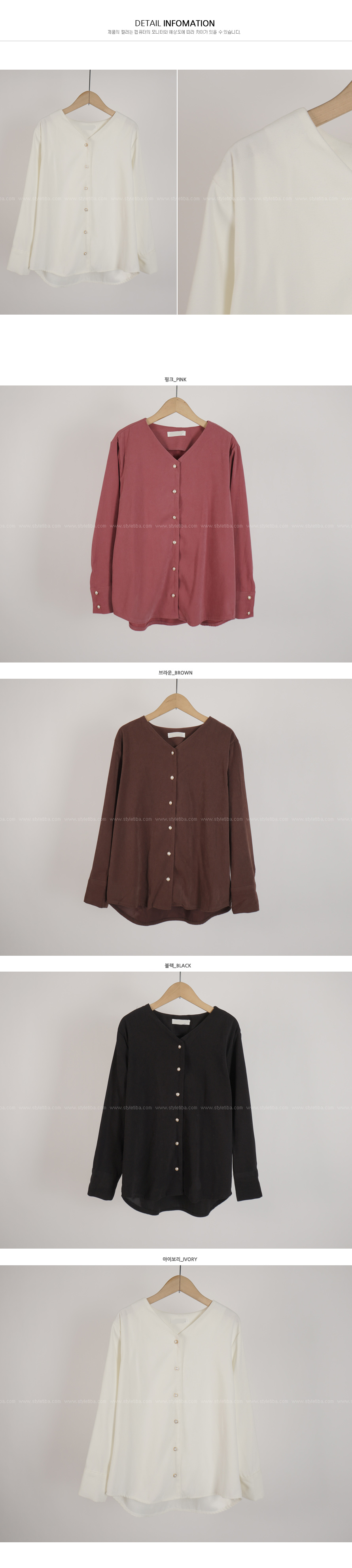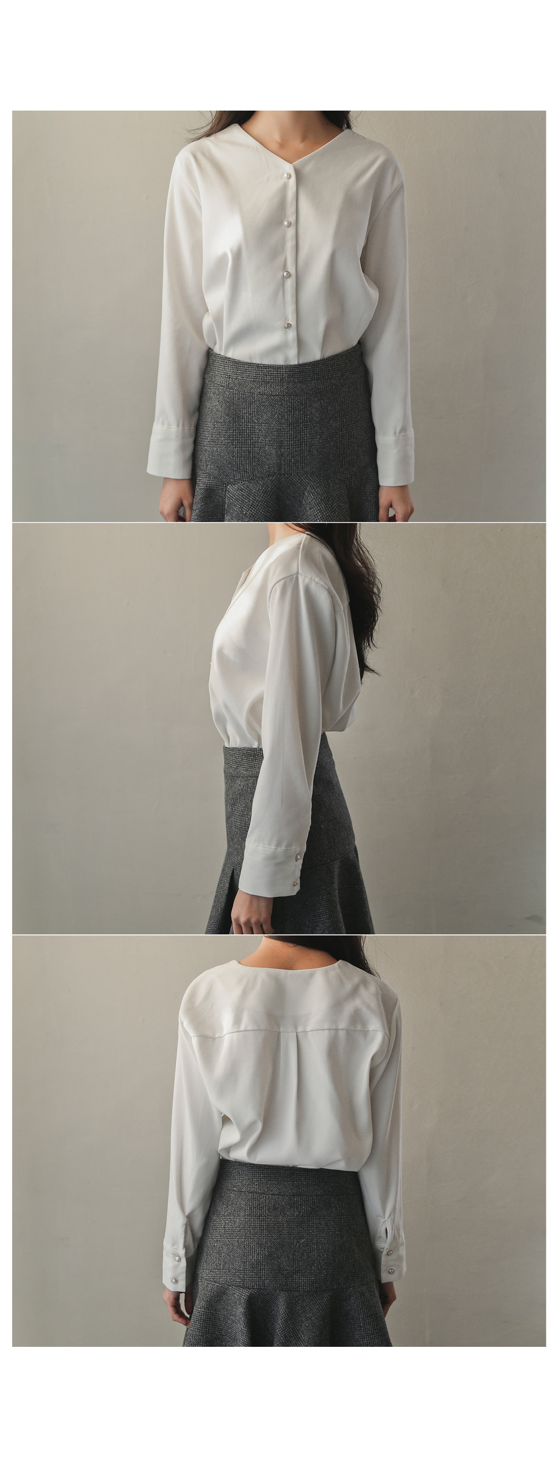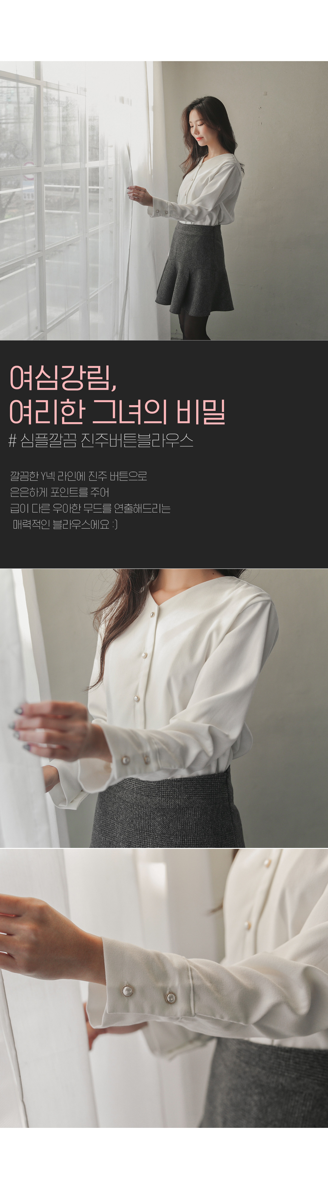 깔끔한 Y넥 라인에 진주 버튼으로 은은하게 포인트를 주어