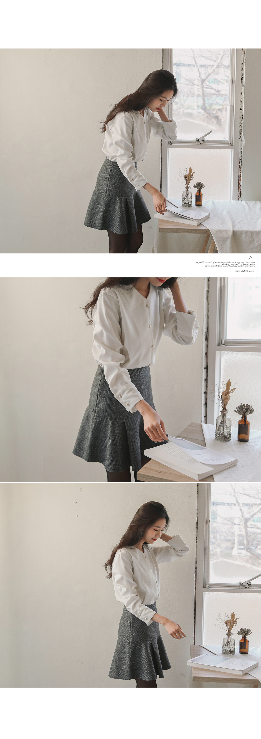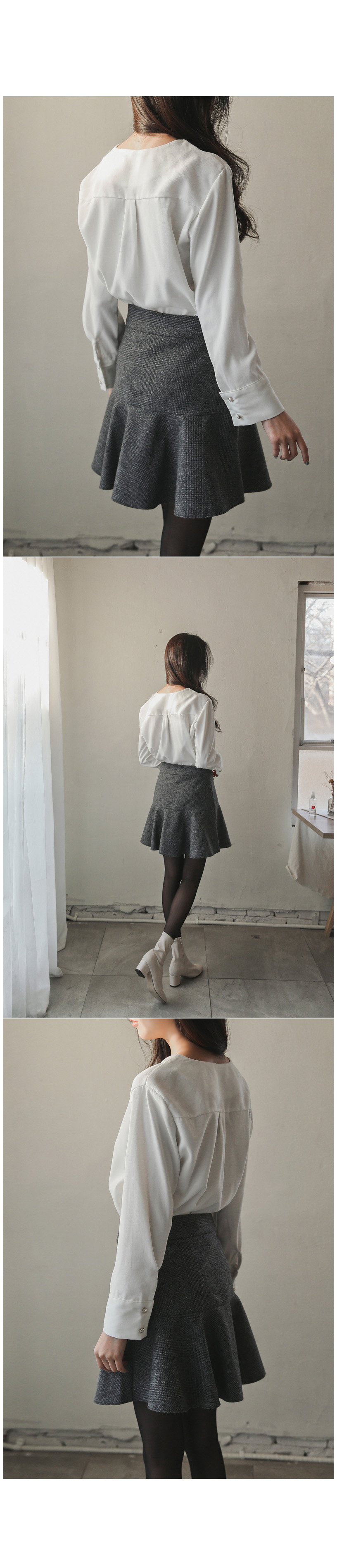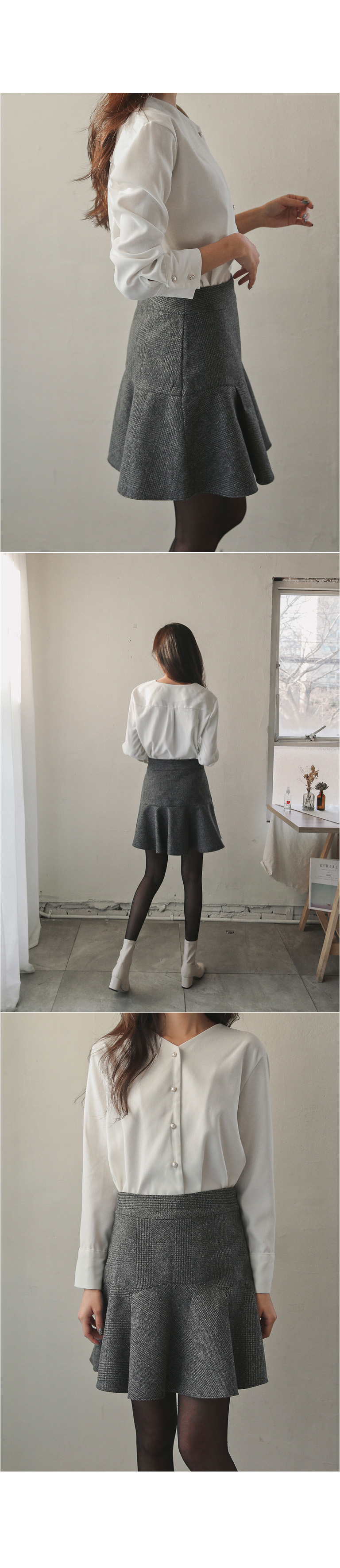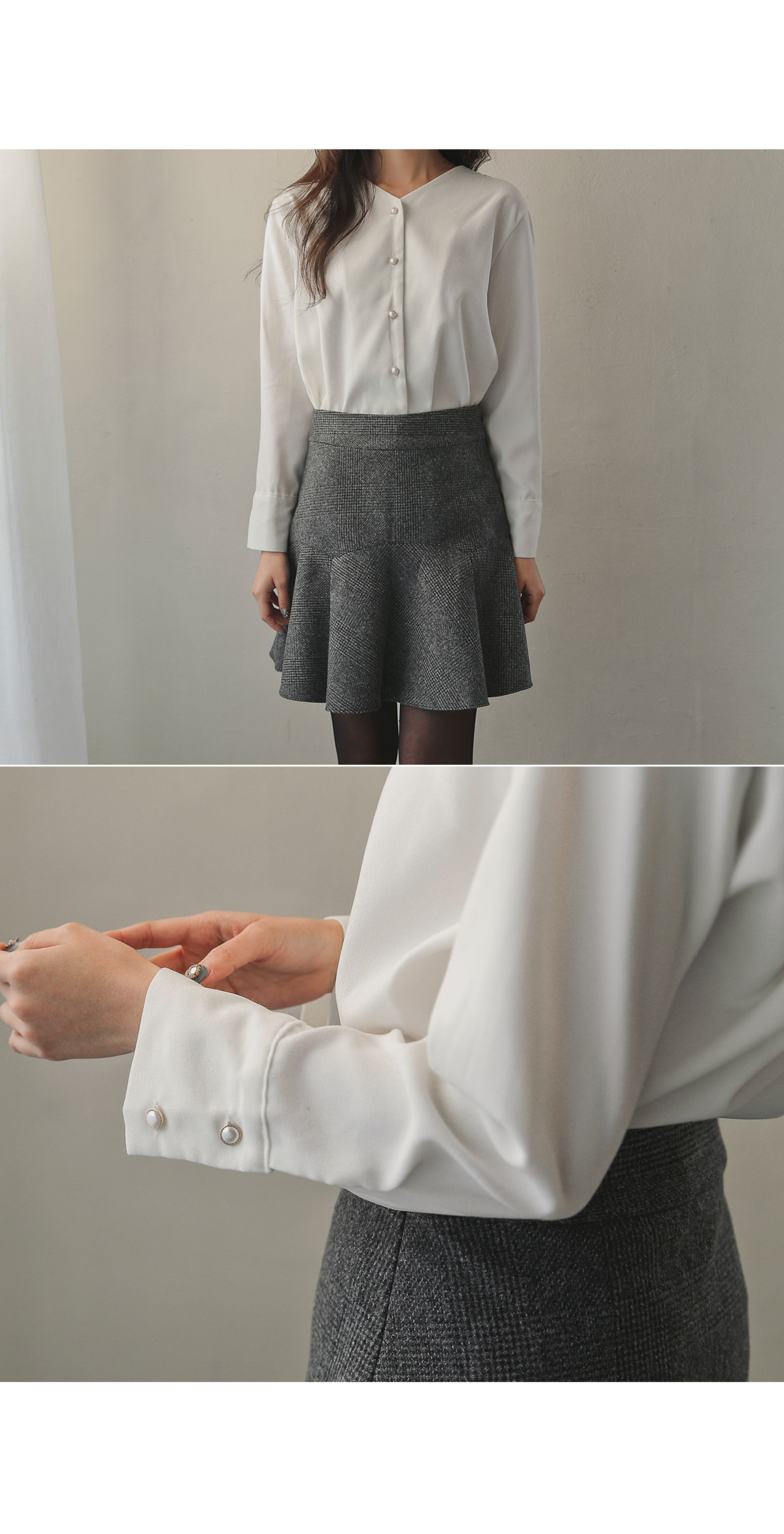 깔끔한 Y넥 라인에 진주 버튼으로 은은하게 포인트를 주어
