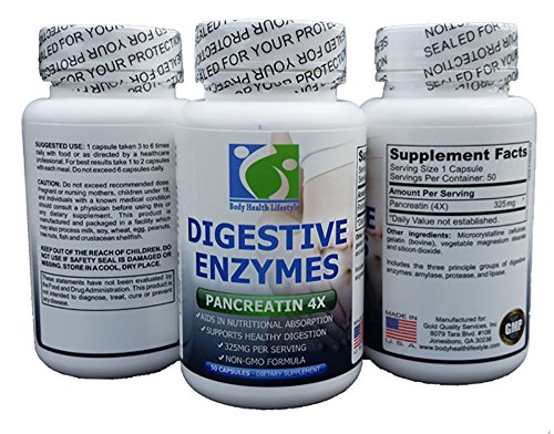 DIGESTIVE ENZYMES; tired of sluggish digestion, gas and bloating? Our quadruple strength Digestive Enzymes provides super strong support to aid digestion of proteins, fats and carbohydrates, to help improve digestive efficiency, in a completely GMO free formula! QUADRUPLE STRENGTH; provides a super potent 325mg doze of our 4x Pancreatin, for super strong, GMO free digestive support without unnatural synthetics or cheap, irritating acid supplements! FULL DIGESTIVE SUPPORT; provides a wide spectrum of premium digestive enzymes with lipase, protease and amylase to aid natural digestion of proteins, fats and carbohydrates! LONG LASTING SUPPLY; ultra long lasting 50 capsule supply for superior digestive support, making constant reordering and running short a thing of the past, with our great value supply! MANUFACTURED IN THE USA; manufactured in the USA in a GMP certified facility for unsurpassed purity and quality in every bottle, and backed by our 100% lifetime quality guarantee, click the Orange Button to order now!Feature