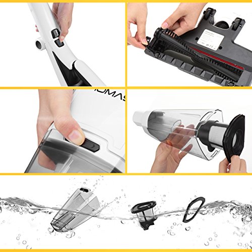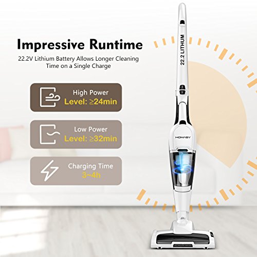 Homasy uses an advanced cyclonic system that separates smaller dust particles from larger items, such as crumbs or coins found around the home, which keeps the motor clean and unclogged to ensure consistent, powerful suction.