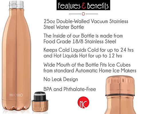 UNMATCHED QUALITY - Niki Carlo 25 oz double walled vacuum stainless steel water bottle is made from 18/8 stainless steel. Our materials and design provide one of the strongest, heavy duty bottles on the market. Durable and lightweight, it can take a beating and still provide you with an ice cold drink.