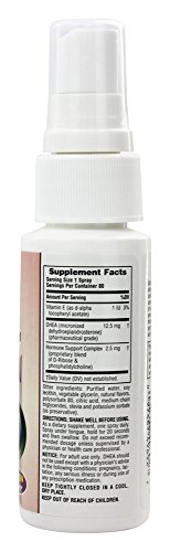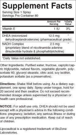 Suggested Use As a dietary supplement Shake well before using. 1 spray daily. Spray under tongue, hold for 20 seconds and then swallow. - Or as directed by your healthcare professional. Supplement FactsServing Size: 1 SpraysServings Per Container: 80Amount Per Serving% Daily Value***Vitamin E (as d-alpha tocopheryl acetate)1 IU3 %DHEA (micronized dehydroepiandrosterone) (pharmaceutical grade)12.5 mg*NADH Complex (proprietary blend of nicotinamide adenine dinucleotide hydrate phosphatidylcholine)2.5 mg* *Daily Value Not Established ***Percent Daily Values are based on a 2,000 calorie diet