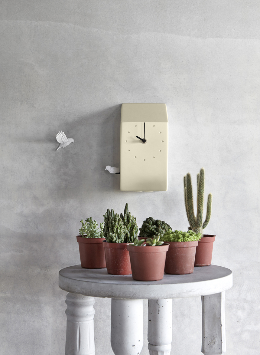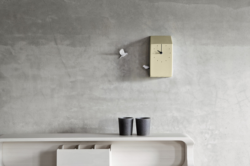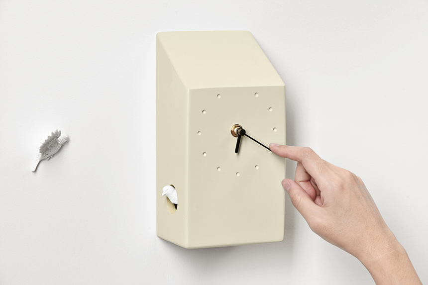제품 디자이너 Griffin Yang을 통해 디자인된 뻐꾸기 벽시계로 정각이 되면 새들의 지저귀는 노랫소리가 들립니다.