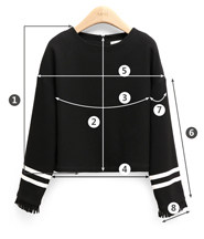 | 尺码 | ①前衣长 | ②后中长 | ③胸围 | ④下摆围 | ⑤肩宽 | ⑥袖长 | ⑦袖臂围 | ⑧袖口围 | ||