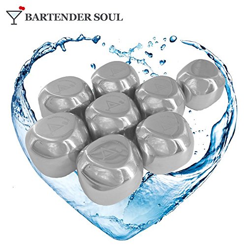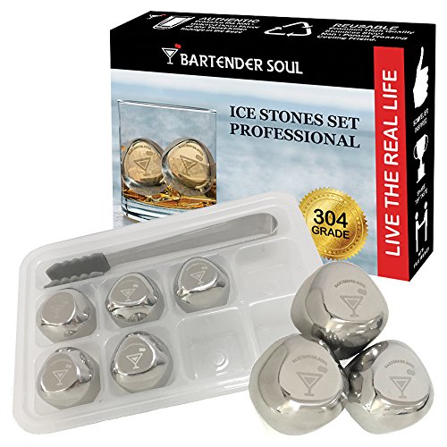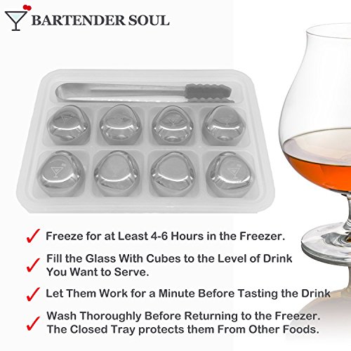 Whiskey Stones Ice Cubes by BARTENDER SOUL (8pcs) with Tongs and Freezer Tray - Non Intrusive Stainless Steel Reusable Rocks for Liquors, White Wine, Beer, Cocktails, Mineral Water