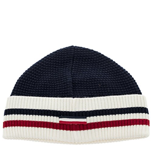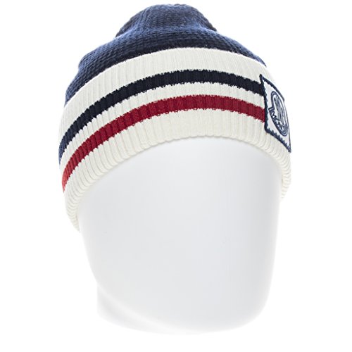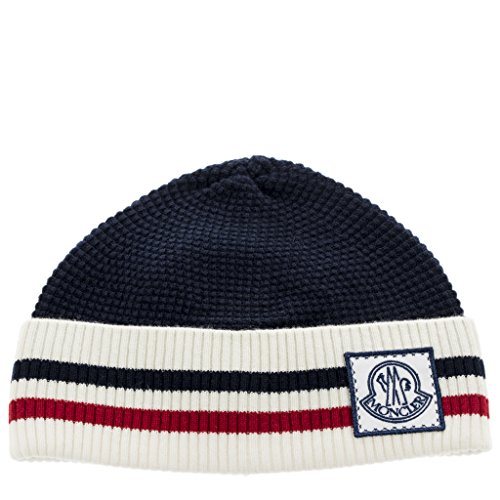 Product Description Moncler Unisex Wool Striped Logo Hat Blue: Moncler beanie hat with tricolor striped trim. Wide band with Moncler logo patch. Virgin wool. Made in Italy. Model: 99284 00 979AU 778. 0