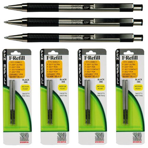 -. Feature : Deal includes: 3 each Zebra F-301 Black ink 1.0 mm Retractable Ballpoint Pens Plus 4 Packs 1.0 mm Black Refills with 2 refills per pack. / Retractable ballpoint pen features a no-slip grip for writing comfort. / Stylish design offers a stainless steel barrel that is lightweight yet durable. / F-301 Stainless Steel Pen also includes a sturdy, metal pocket clip to attach pen to notebooks, pockets and more. / Refillable.