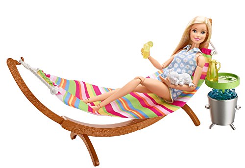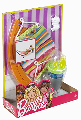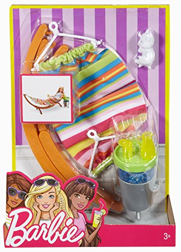 Soak up the sun with the Barbie collection of outdoor furniture plus pet packs, like this kitty and hammock set. They help set the scene for a perfect day outside with a pet friend to help enjoy the fun (doll sold separately). Arrange and rearrange the pieces to tell outdoor stories. Traditional furniture pieces have signature style, and accessories add to the play possibilities. The modern curved hammock sports colorful stripes and actually swings; the cool side table holds an ice bucket below. A pitcher and glass of ice tea look good enough to drink. And the adorable white kitty is ready to snuggle and nap for nurturing pet play. Open the door to imagination with this play set that lets kids explore outdoor fun. Add variety to Barbie doll’s play spaces by collecting all of her outdoor furnishings and accessories (each sold separately, subject to availability). Set includes swinging hammock, ice bucket table, pitcher, glass and kitten figure. Colors and decorations may vary.Feature
