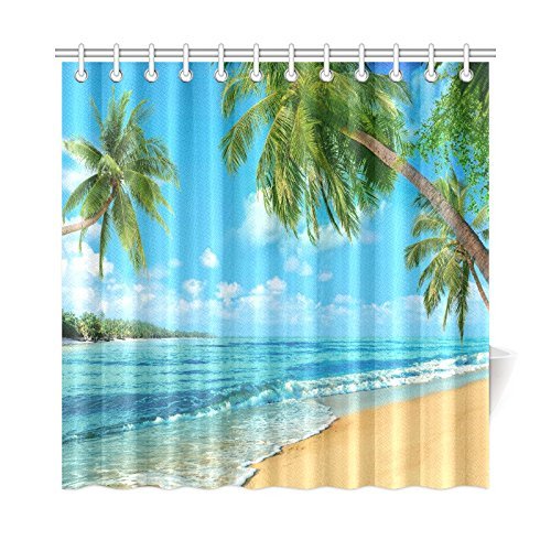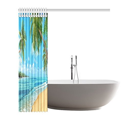 InterestPrint Tropical Island Decor, Oceanfront Waves Palm Trees Beach Turquoise Picture Print, Polyester Fabric Bathroom Shower Curtain Set With Hooks, 72 By 72 Inches Extra Long, Green Blue White