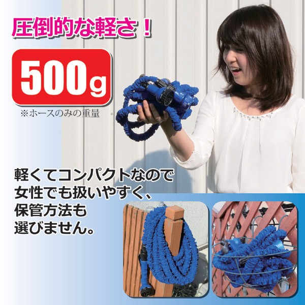 一見、普通の短いホースに見える本品「こんなホースで水を撒くことができるの?」と思って水道栓をひねってみると、見る見る間に5mしかなかったホースが、もこもこっと約3倍の長さ、15mまで伸びちゃいます。もちろん、長さだけでなく、散水ノズルも7種類の散水パターンを選べる本格ホースセットです。ホースリールでよくある、伸ばした時のホース絡みもありません。従来の重くてカサばるホースリールとは違い、重さは500g(ホースのみ)と軽量でしかもコンパクトなので、女性でも持ち運びがラクで収納も面倒なし。